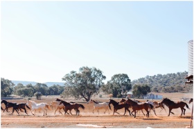 A herd of horses running through an open countrysi