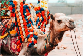 Vibrant camel adorned with colorful tassels in a s