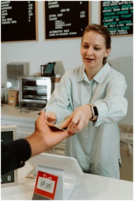 A barista receiving cash from a customer at a coff
