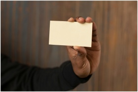 A close-up shot of an unrecognizable man holding a blank business card against a wooden background.