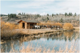 Idyllic fall scene with horses near a rustic hut by a lake