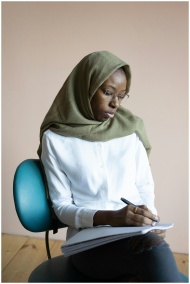 Serious young African American Muslim female wearing casual outfit hijab and eyeglasses taking notes in copybook while sitting on chair in light room