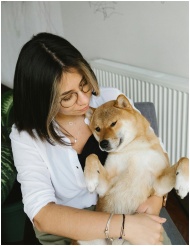 From above content female in casual clothes hugging adorable purebred Shiba Inu dog while sitting together on comfy armchair
