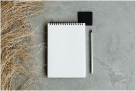 Flat lay of a notepad and pencil on a concrete surface with dry grass, offering ample copy space for text or designs.
