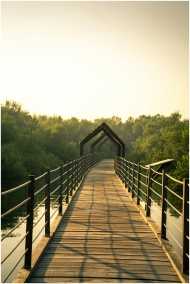 A picturesque wooden bridge over tranquil waters amidst lush greenery at sunrise.
