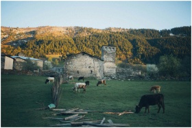 A peaceful rural landscape with cows grazing near rustic stone buildings and lush mountains.