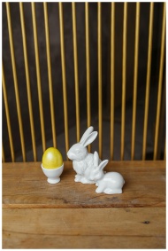 Porcelain rabbits beside a yellow Easter egg in an