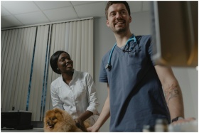 Veterinarians smile as they examine a Pomeranian dog in a medical office setting.