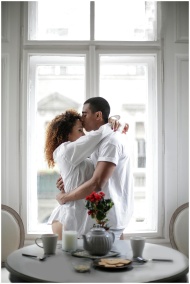 A loving couple shares an intimate moment by a window, creating a serene and romantic ambiance.