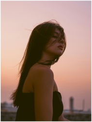 A young woman stands at sunset, hair blowing gently in the wind, evoking a serene and artistic mood.