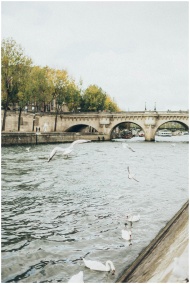 Serene view of swans and seagulls on the Seine River near an iconic stone bridge in Paris.