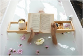 Enjoy a tranquil bath with a book surrounded by fl