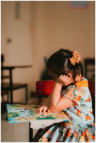 A teenage girl in colorful traditional attire sitt