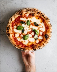 Close-up of a fresh Margherita pizza with mozzarella and basil, held over a gray background.