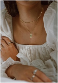 Close-up of a woman wearing a white dress and gold jewelry, showcasing elegance and style.