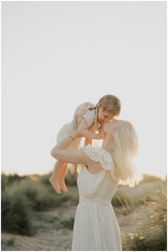 A serene moment of a mother embracing her child on a sunlit beach during sunset.