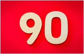 Minimalist depiction of wooden numbers '90' against a vivid red backdrop, capturing simplicity and elegance.