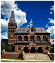 Majestic historic building at Gallaudet University with clear blue sky backdrop.