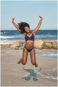 A woman in swimwear joyfully jumps on a sunny beac