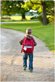 A young boy with a red backpack walking on a gravel path in a sunny park setting.