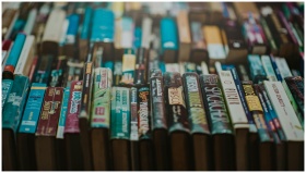 Close-up of various books on a shelf showcasing an array of titles and genres.