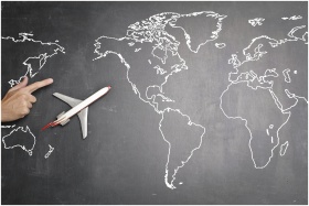 Top view of miniature airplane placed on over gray world map with crop hand of anonymous person indicating direction representing travel concept