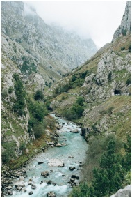 Beautiful misty mountain gorge with a flowing river through lush greenery.