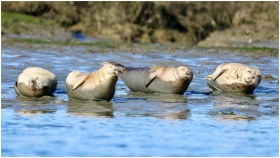 Four harbor seals basking on a sunny California sh