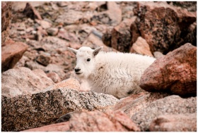 A young mountain goat resting amidst rocky terrain in Colorado's Mount Evans.