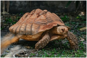 Close-up of a Sulcata Tortoise walking outdoors in