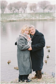 Charming elderly couple in winter coats by a seren