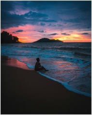 Tranquil beach scene during sunset featuring a solitary silhouette by the ocean.