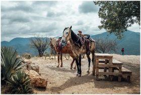 Saddled horses resting in the rustic outdoors of Oaxaca, Mexico, with mountainous scenery in the background.