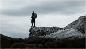 A lone hiker stands at the edge of a rugged cliff