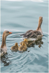 A serene scene of geese with goslings swimming in calm blue water, showcasing nature's beauty.
