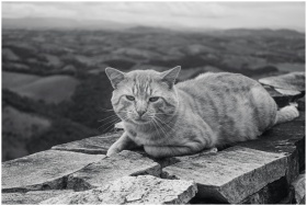 Black and white photo of an orange tabby cat lying on a stone wall in a scenic landscape.