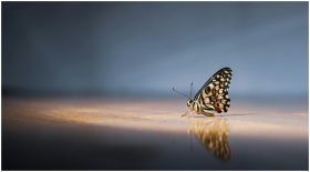A detailed close-up of a butterfly resting on a reflective surface, highlighting its vibrant patterns.