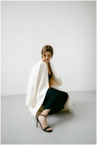 Elegant woman wearing a white coat and black outfit in minimalistic indoor setting.