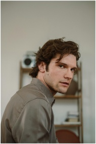 Casual portrait of a man looking over his shoulder indoors, with a neutral background.