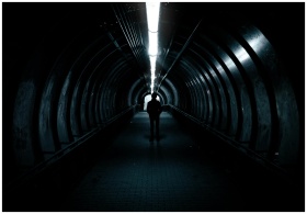 A lone figure stands in a dimly lit tunnel, creating an air of mystery.