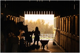 Silhouetted figures with horses in barn at sunrise, capturing rural lifestyle.