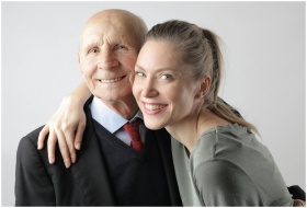Cheerful elderly man and adult woman cuddling on white background and looking at camera