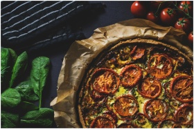 Delicious rustic quiche topped with tomatoes, idea