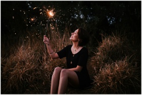 A smiling woman enjoying sparklers outdoors in a g