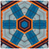 Colorful geometric abstract art featuring bold orange and blue hues in symmetrical patterns.