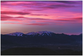 Gorgeous twilight sky with pink hues over a peaceful snow-capped mountain range.