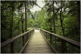 Explore a scenic wooden walkway through a serene green forest, perfect for nature lovers and hikers.