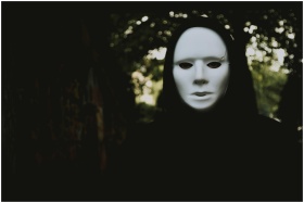 A mysterious figure in a white mask lurking in an