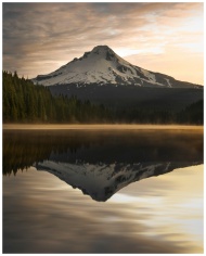 Idyllic sunrise view of snow-capped mountain reflected in a tranquil lake, surrounded by lush pine trees.