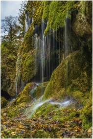 Tranquil waterfall cascading over mossy rocks in a lush forest setting. Perfect nature background.
